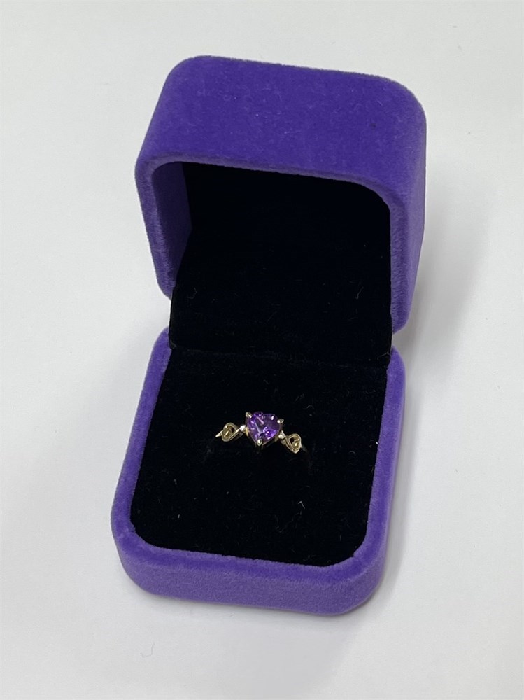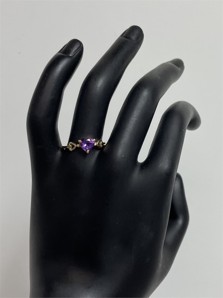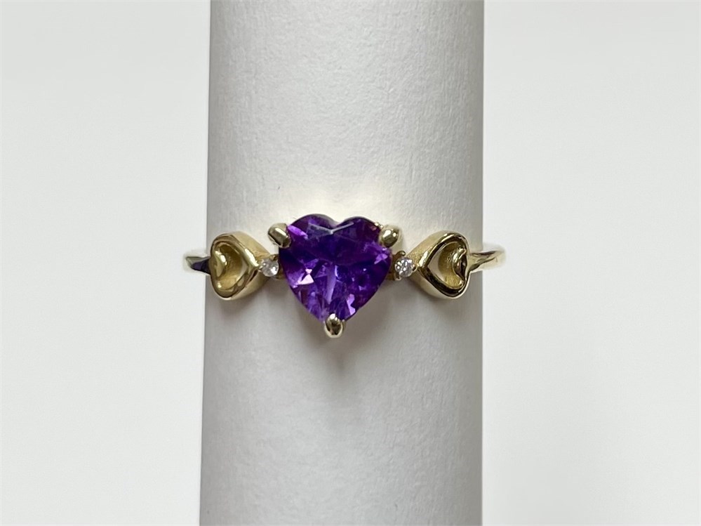 This pretty ring features a deep purple heart-shaped stone, probably spinel.  It's accented with two tiny diamonds and heart shapes in the yellow gold setting.  Marked 14K.  Like-new condition.  Size 5 3/4.