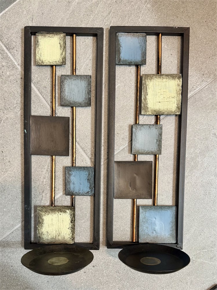 Modern metal wall sconce set, created with neutral colored squares. Candle holders have flip up plates so they don’t  to get in the way. This aesthetic blends with a variety of styles and is unique enough to be its own statement piece without drawing too much attention in