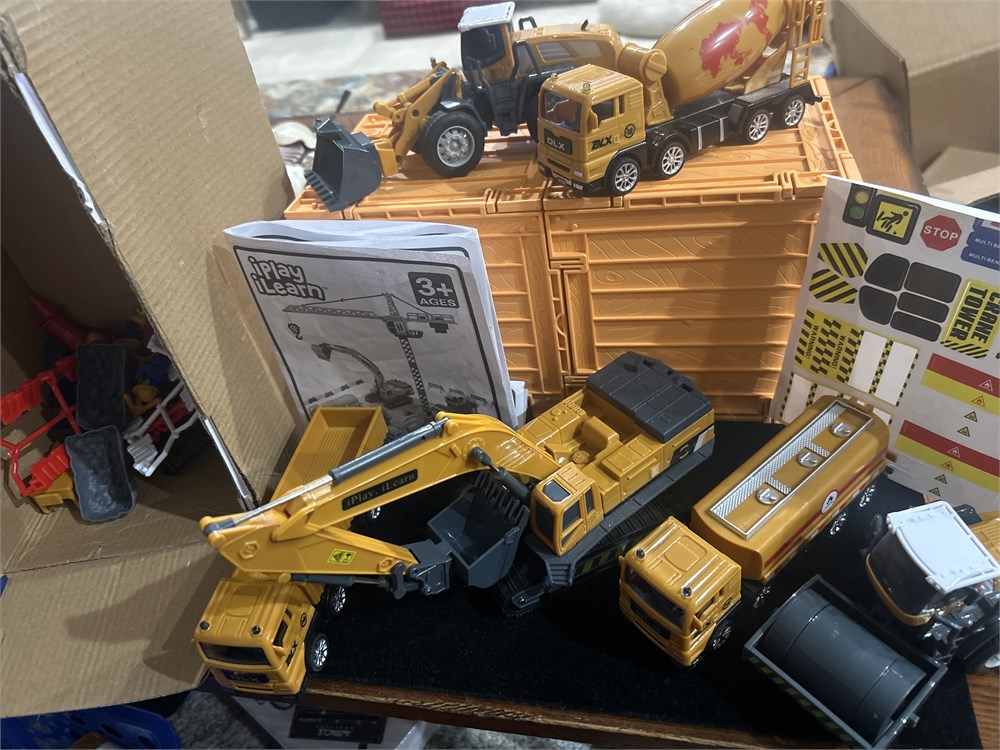 I play I learned dump truck excavator, fuel tank, roller front and loader concrete truck crane total package, including shipping. Box doesn't look like it's ever been really used. Comes with the directions six construction trucks and much more.