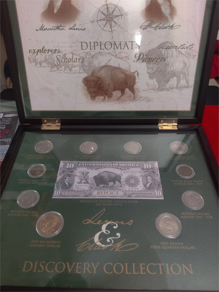 Lewis and Clark Discovery Collection coin set. There are 10 coins included in this collection. Queens include 2005 Sacagawea dollar, 1913 to 1938 Buffalo nickel, Indian Head Penny, 2004 Lewis and Clark handshake nickel, 2004 Lewis and Clark keelboat nickel, 2005 Lewis and Clark Buffalo nickel, 2005 Lewis and Clark Ocean view nickel, another Indian head penny another Buffalo nickel and a 2005 Kansas State quarter. All come in a nice display box.