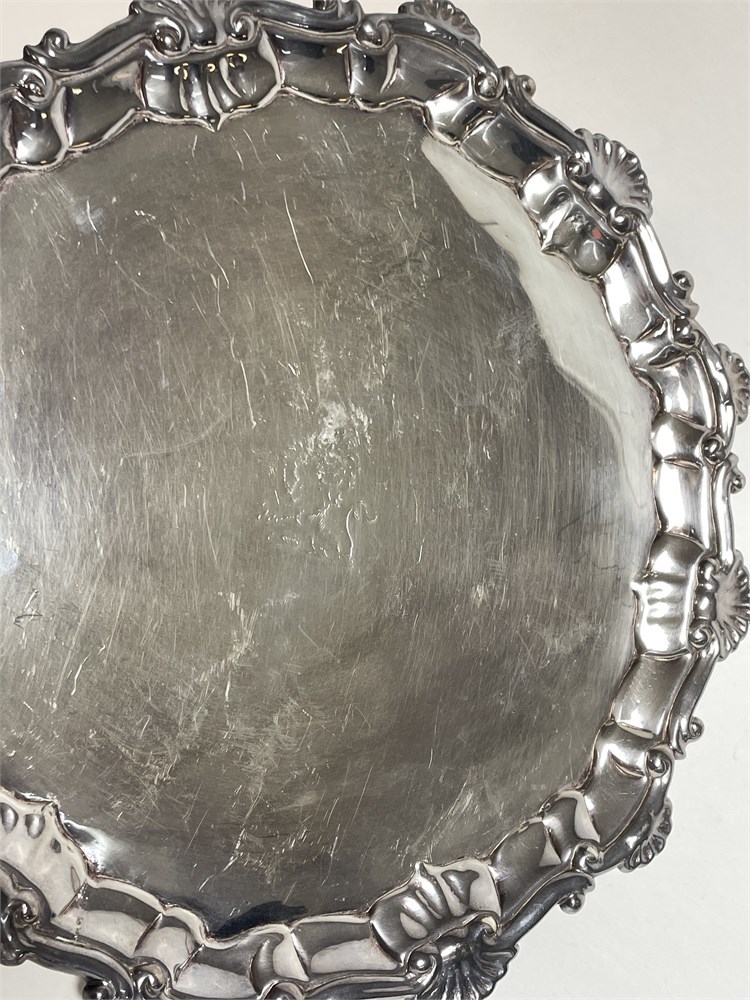 An English sterling silver three-footed salver or card tray, embellished in the center with an engraved lion.  Not monogrammed.  It is hallmarked with a lion passant for sterling, also maker's initials R.R. for Richard Rugg of London, and date letter "t".  Condition includes surface scratches.  Diameter: 7".