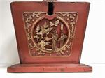 A carved wood box with gilt trim, a teapot caddy, or wedding box.  The top handle has a small swinging notch that "unlocks" it so it can be lifted away from the lid.  The front of the lid has some repair.  Overall condition looks nice.