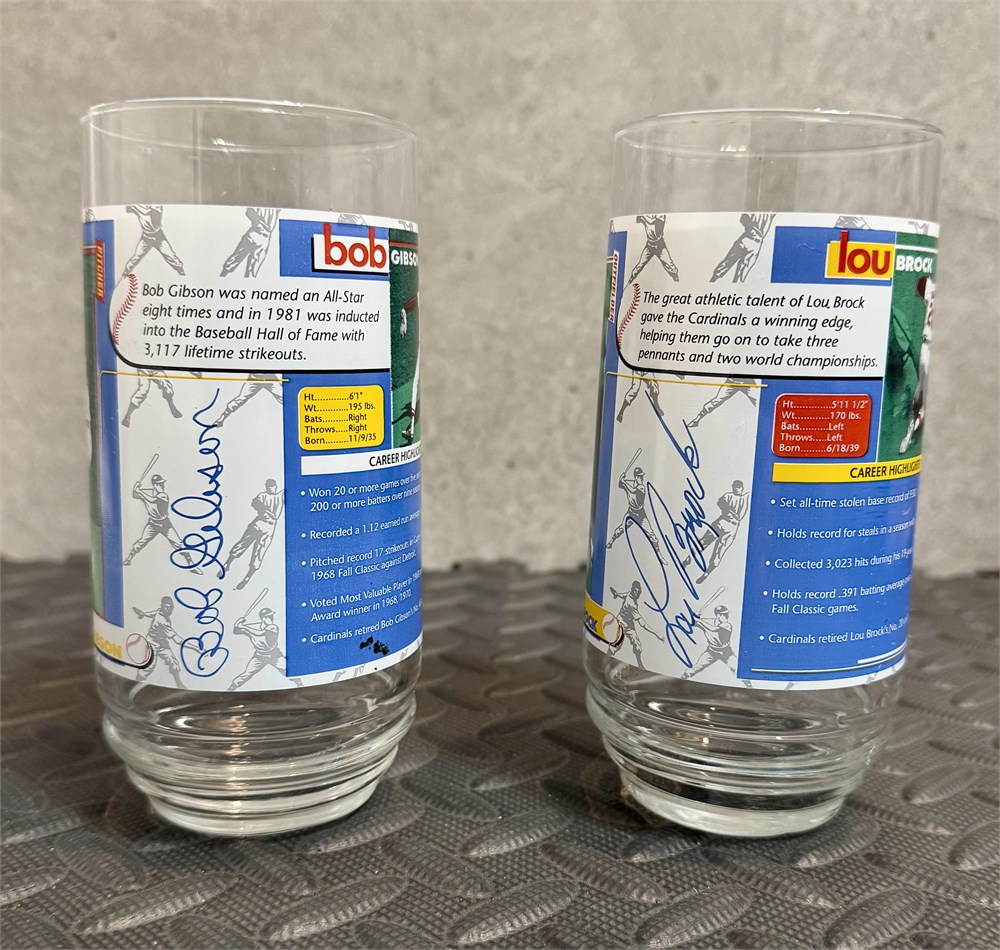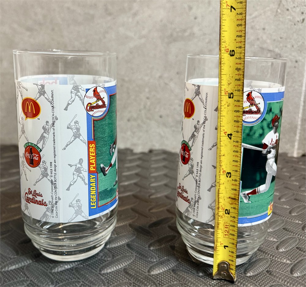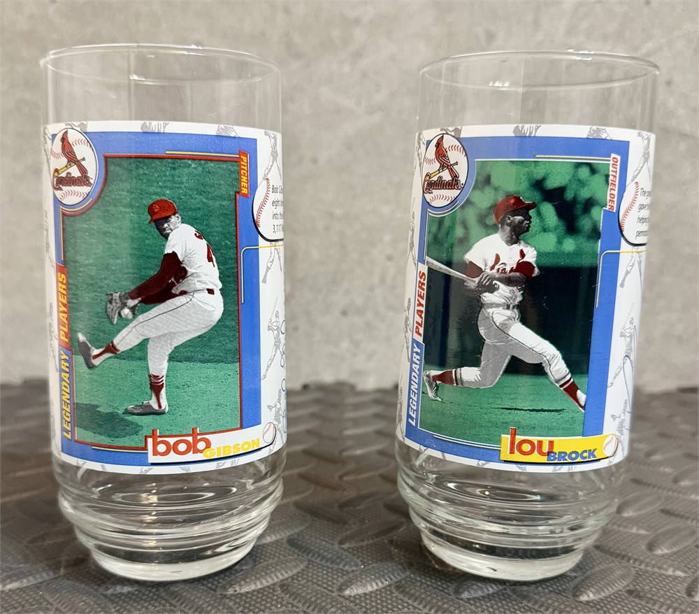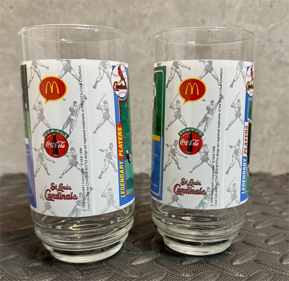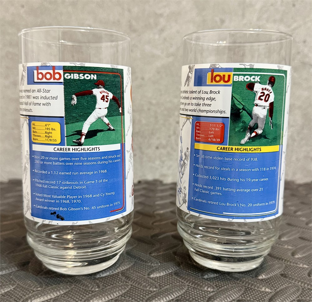 2 glasses from the 1998 release of the “Legendary Players” McDonald’s glass collector cup series for the St. Louis Cardinals. One glass is Lou Brock and the other is Bob Gibson. Both glasses in excellent condition with no chips or cracks. 6” tall 2 5/8” wide.