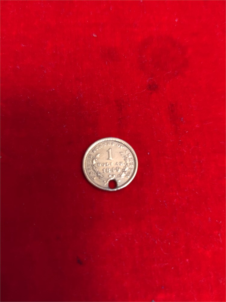 1849 Liberty Head US $1 gold coin. Queen has a hole through the top and was probably used as a pendant on a necklace. Total weight is 1.56 g.
