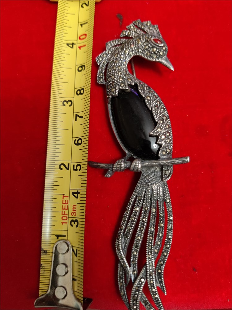 Large Peacock Brooch Vintage Sterling Silver Marcasite Black Onyx Carnelian Eye 26.85g.