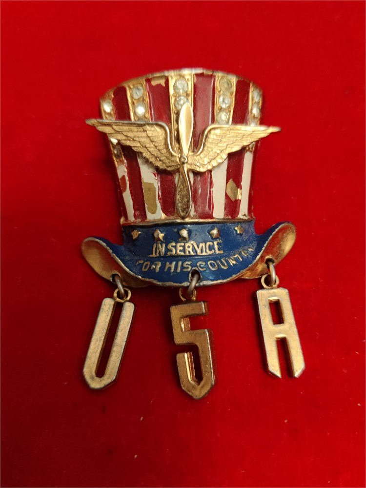 Vintage World War II in service for his country Uncle Sam hat pin. Item is in very good condition and still has all three USA letters hanging from the bill.