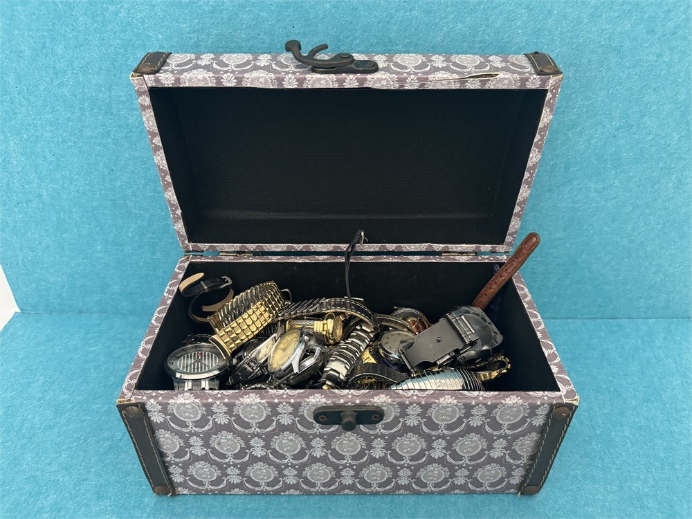 Good for jewelry making, parts, or even collecting. Comes in a treasure box measuring 9 1/4” L x 5 1/4” T x 5 1/4” W. See photos for measurements and the assortment of watches.