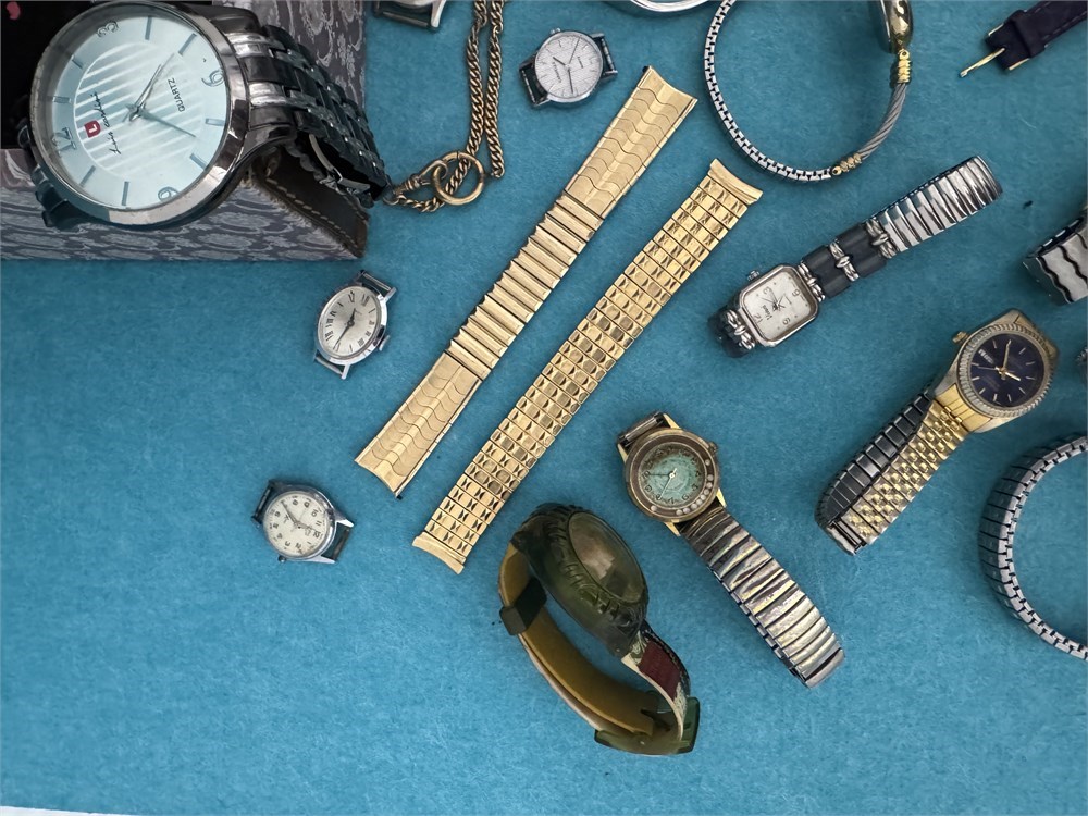 Assortment of around 30 different watches, 2 wrist bands, a pocket watch chain and 8 watch faces. Assortment includes whole watches, watches with broken straps, faces, bands and chain. Brands include Timex, Seiko, Cavallero, Echo, Fossil.