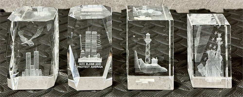 Lot of 4 3D laser etched crystal glass paperweights.