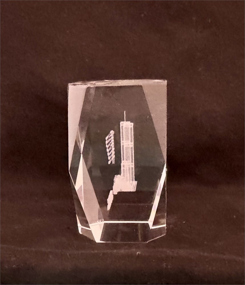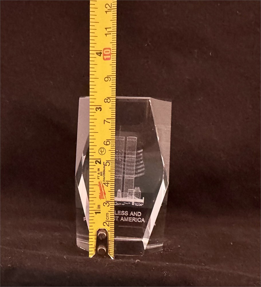 World Trade Center, Twin Towers and eagle commemorative piece. No extra statement necessary. Piece though powerful does have the most blemishes, all of which are photographed and circled if difficult to differentiate in photo. Damage doesn’t appear to have weakened the crystal in any way. Care is still advised when handling as a safety precaution.