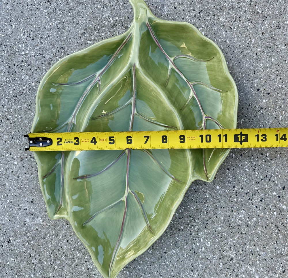 Banana leaf plate by the Florida Marketplace. Measurements 14” x 6 1/4”.  The long palm/banana leaf could be the center of your dining room table adding a splash of color and a natural element to your design, (while holding your s&p shakers) excellent condition