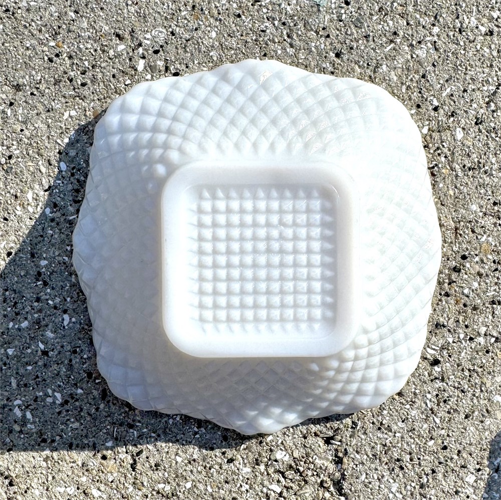 Indiana Glass milk glass serving tray. Solid beautifully opaque white milk glass serving tray. Has a rum well design on the top as to catch any access liquid from soaked cakes of the era. Diamond design, as beautiful as it is functional. Measurements 10” serving square 6 3/4” tall. This piece alone in this condition has been sold for $60-$120 elsewhere online. Grab it while you can!