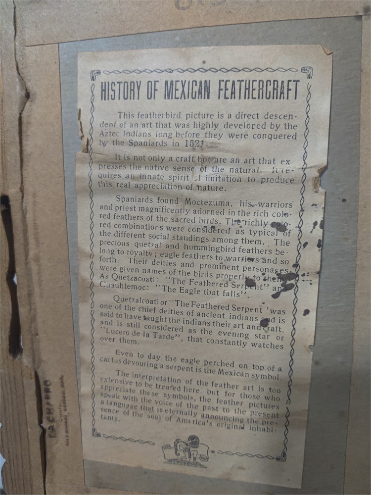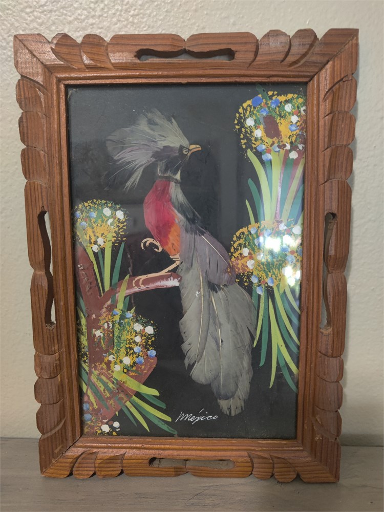 Vintage Mexico Hand Painted Exotic Bird with Feathers Framed Art Painting