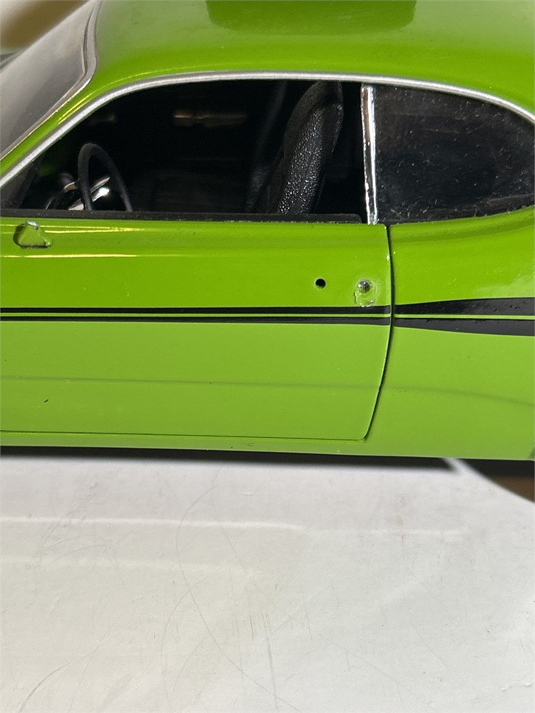 124 scale demon green and black has broken tire on front can be repaired. Otherwise not bad shape couple little things missing.