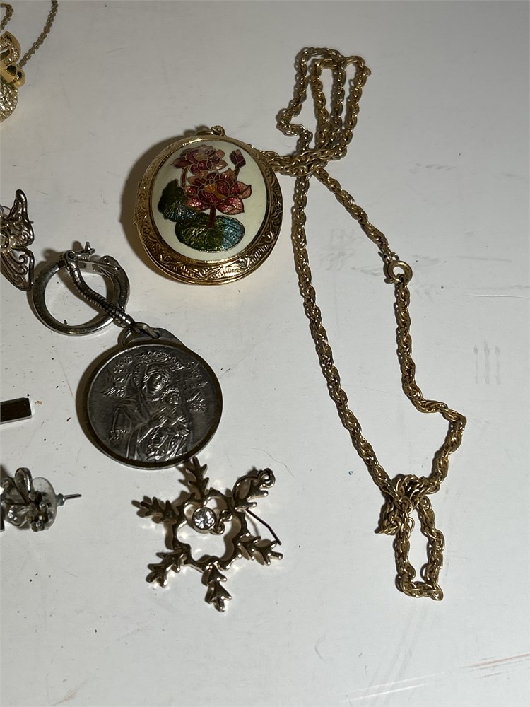 Gold tone necklaces, and pins and earrings  Silver crosses and pins everything pretty much a religious