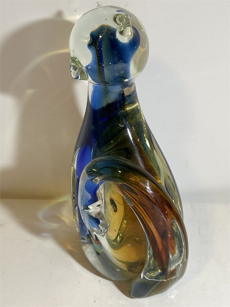 Blue and orange glass paperweight Cat with fish in the middle 3.5 pounds 4 1/2 inches wide 7 1/2 inches tall 2 inches thick