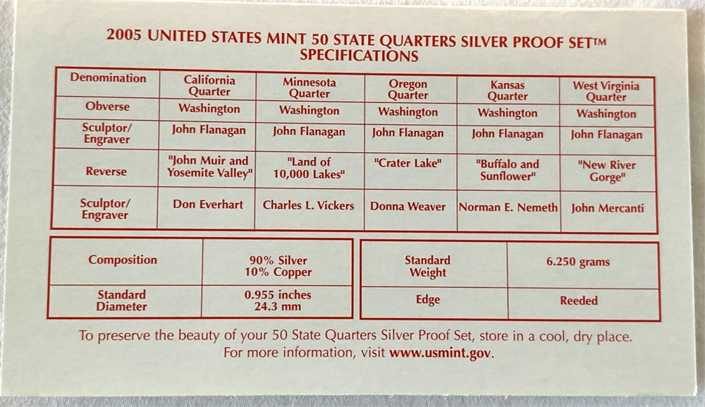 From 2005. Produced at the San Francisco Mint. The silver content is 90%. Total of five proof quarters in the original package with a COA.