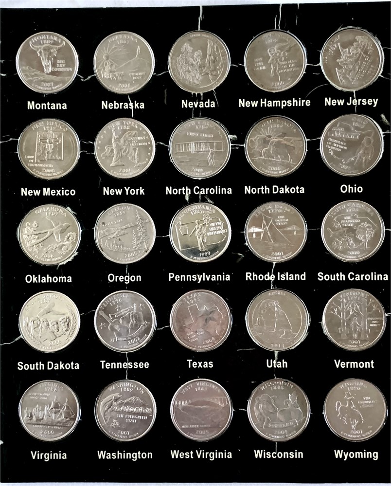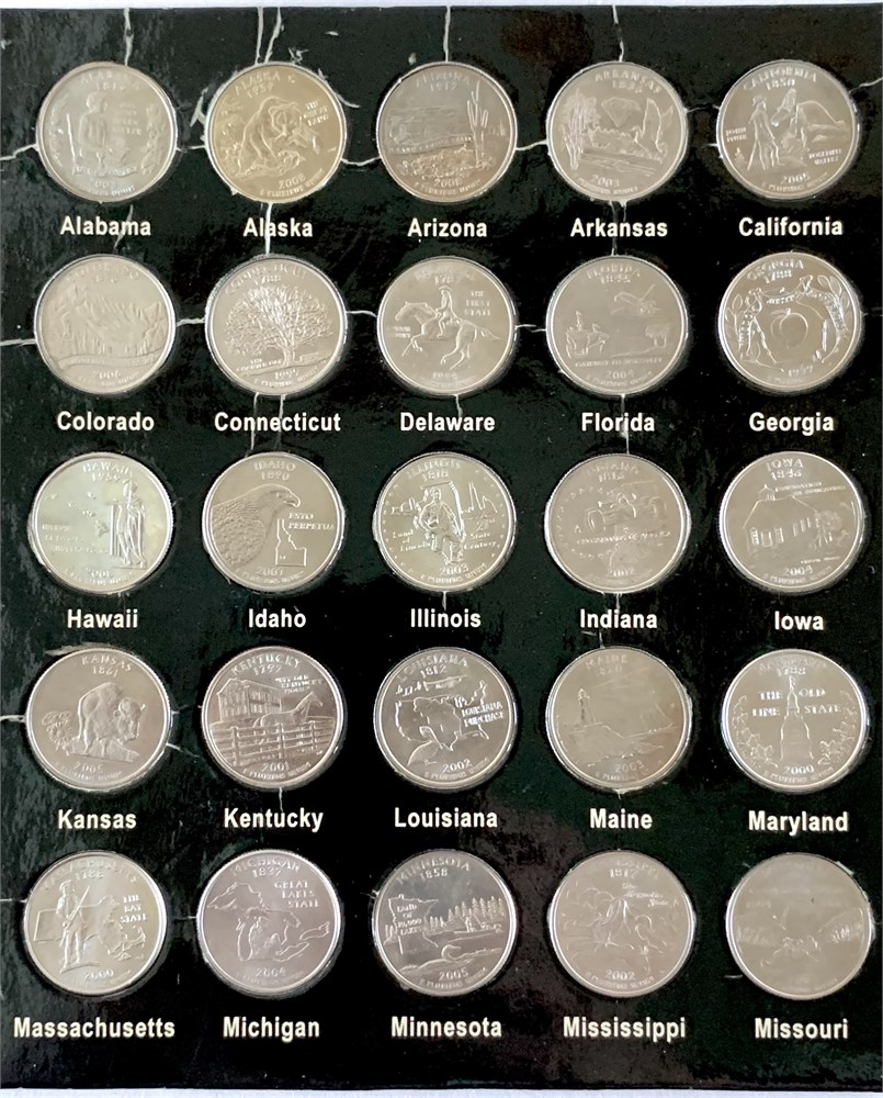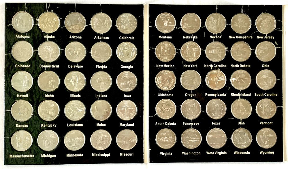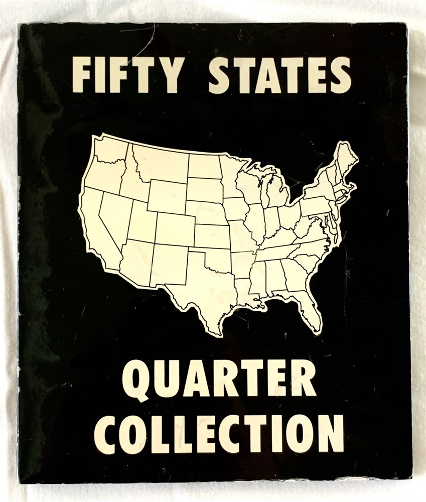 This collection includes 50 state quarters in a display folder. The folder has age related wear.