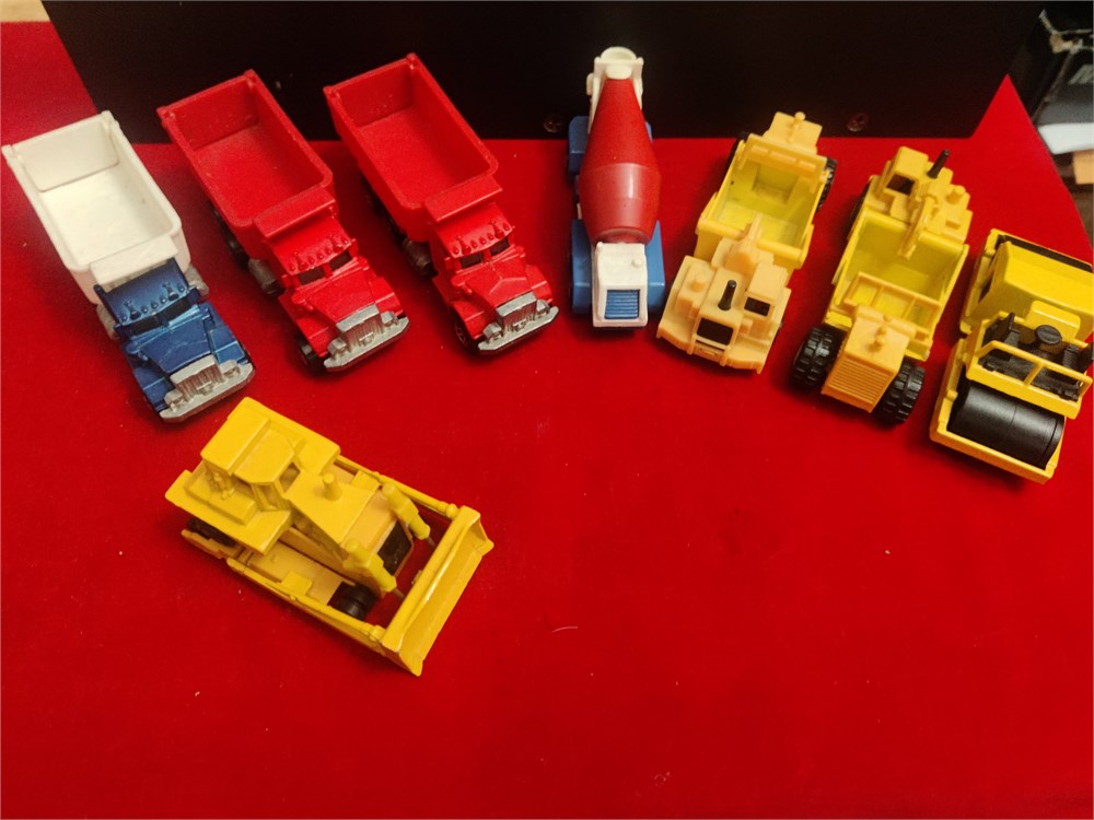 Nice lot of Hot Wheels construction vehicles. The three dump trucks and bulldozer are from 1979 the road graders and steamroller are from 1986 and the cement mixer is 1991. All are in good condition.