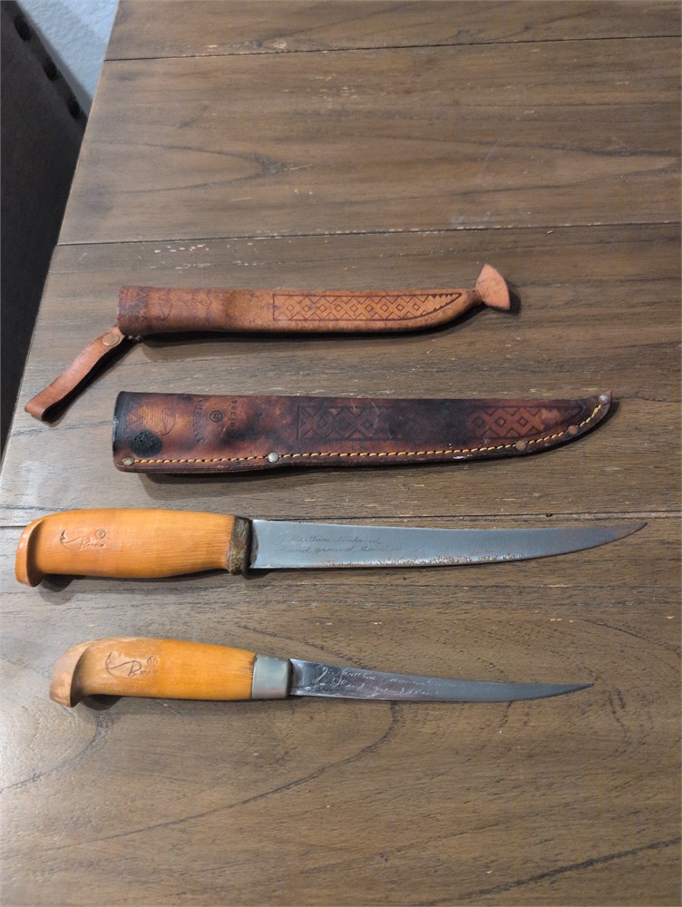 These are two beautiful wooden handled knives with sheath. They are fillet knives. They are two different sizes. They are both hand ground stainless both made in Finland. Overall very good. Vintage condition