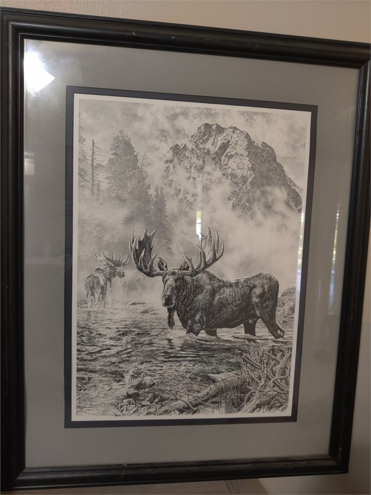 1981 Morning Mist Moose Litho Print - Bill O'Neill 30"x25" in frame.