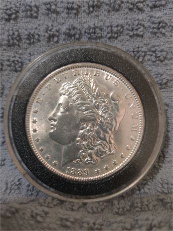 Very nice 1889 Morgan silver dollar. Dollar comes in two-piece plastic case. Dollar has great shine and nice detail on both sides.