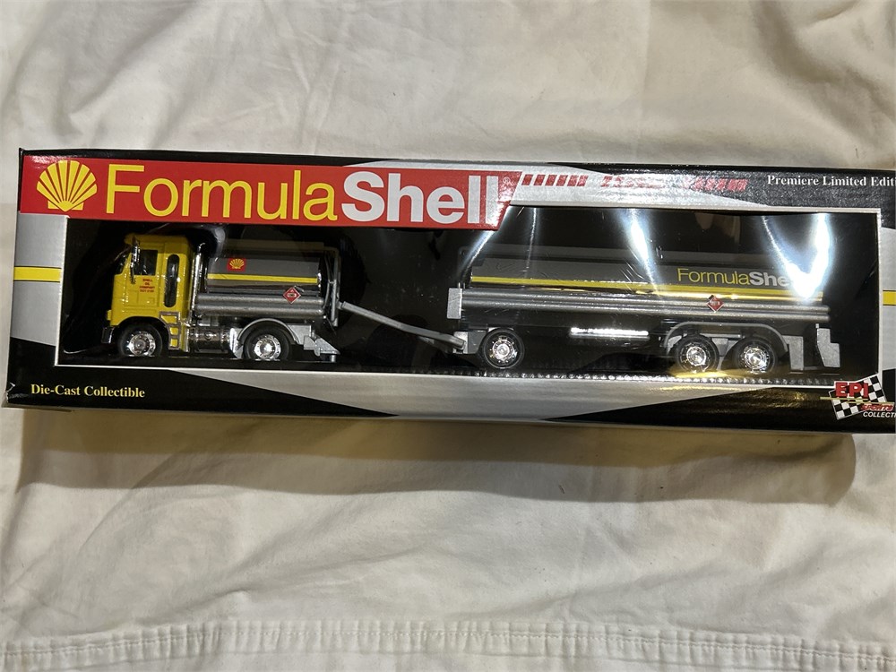 Limited edition, collector series, diecast, metal construction formula, shell fuel, truck  and tanker New in the original packaging truck and trailer 13” x 3”