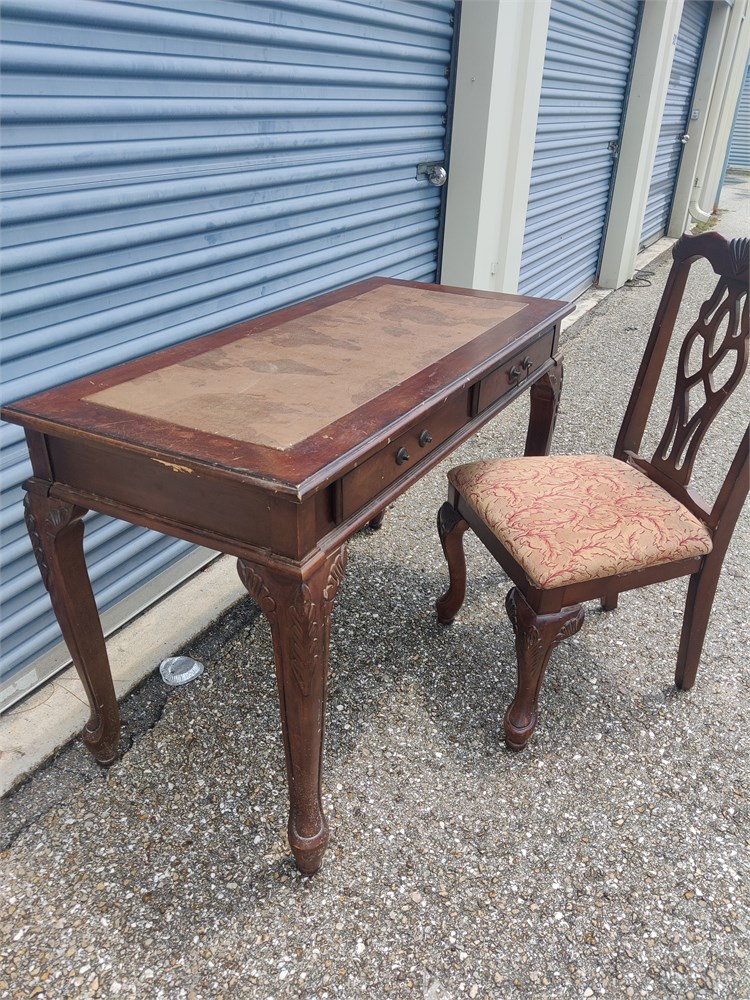 Hardwood Leather Map Writing Desk with Chair. Desk and chair do signs of wear. See pictures for condition. Measures 48"x23"x31".