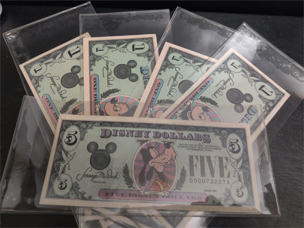 Lot of five Disney dollars. All these bills are from 1989. Includes one $5 bill with Goofy and four $1 bills with Mickey Mouse.