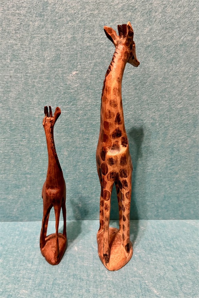 Lot of hand carved wooden elephants and giraffes.elephants are missing tusks ans the giraffes missing an ear. Otherwise nicely done!