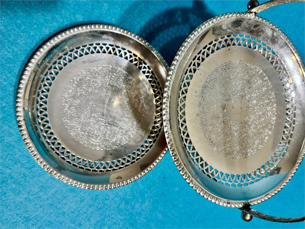 Ornate 3 tier serving tray from England. Beautifully decorated with floral designs. Folds up and out of the way. Nice centerpiece for afternoon tea and biscuits! Has tarnish but could polish up nicely! Doesn’t specify type of metal.