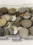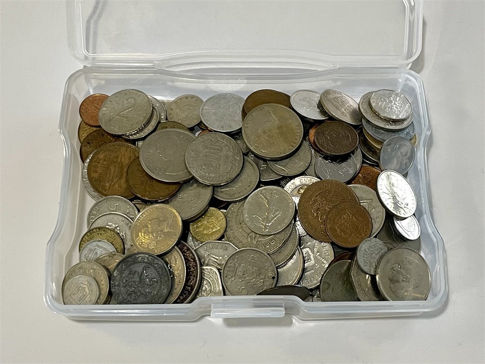 An assortment of world coins in a little plastic storage box.  Treasure hunt!