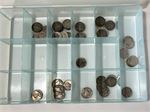 Several coins in a divided organizer labeled as war nickels, 1942-1945, 35% silver.  From local estate.