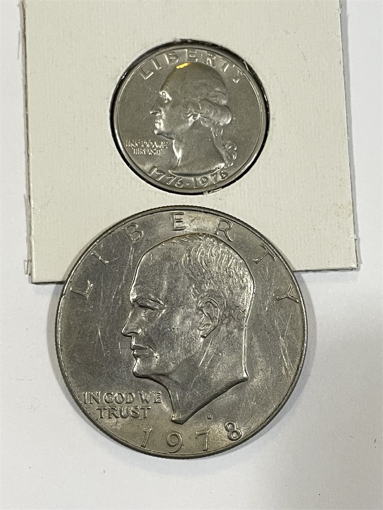Collectible coins including two dollars, three halves, one Bicentennial quarter.