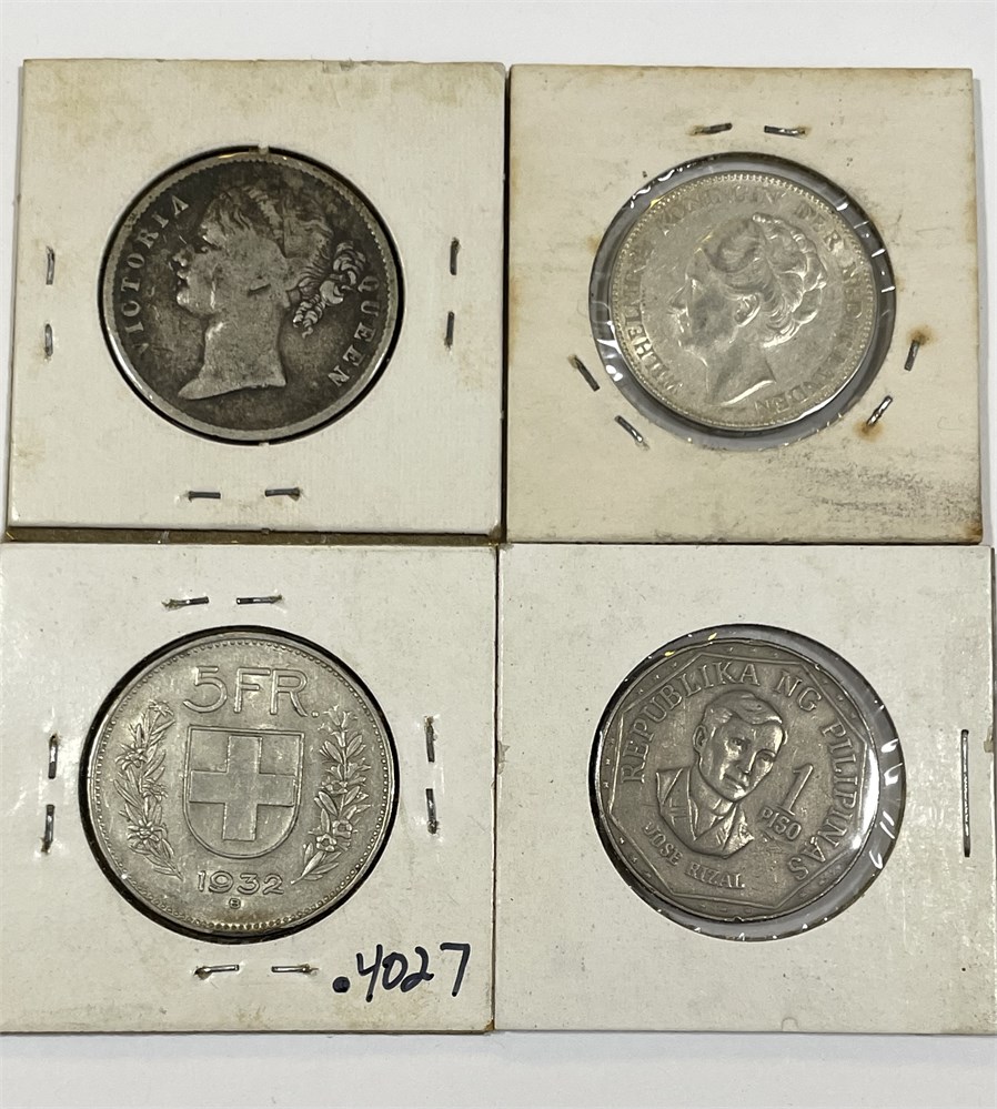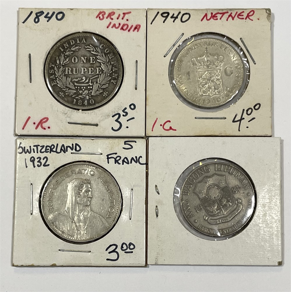1840 East India Rupee, 1940 Netherlands 1G, 1932 Swiss 5 Franc, 1981 Phil. Piso