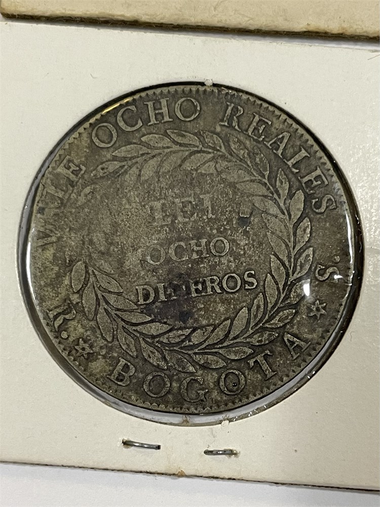 1843 Colombian 8-Reales, .666 silver; Lettering: VALE OCHO REALES, LEI, OCHO DINEROS, R. BOGOTA S. and REPUBLICA DE LA NUEVA GRANADA, 1843.