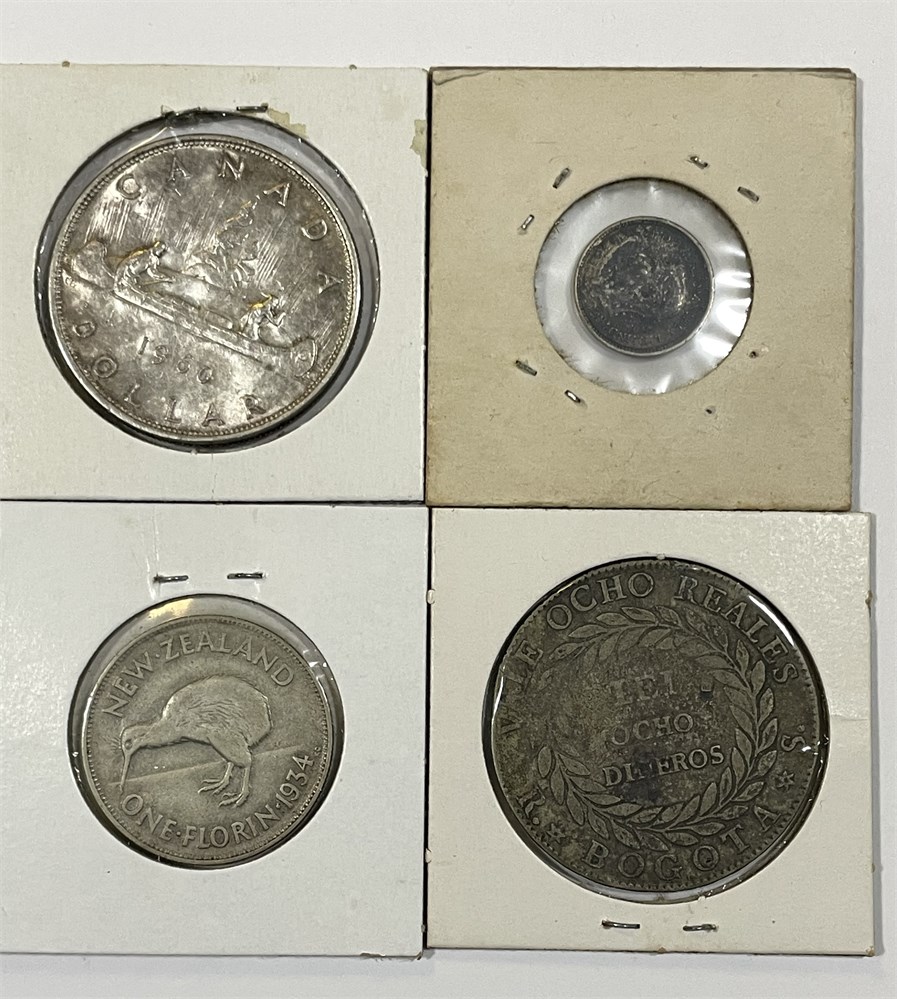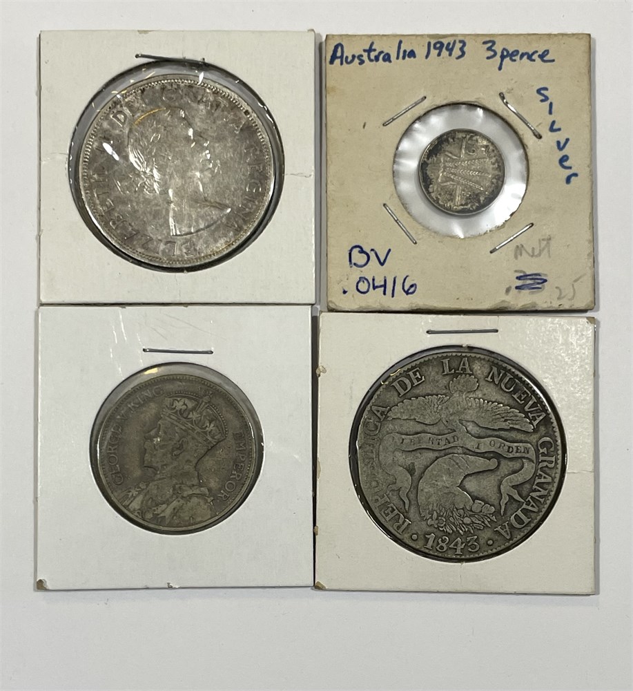 1960 Canada $, 1943 Australia 3P, 1934 N Zealand Florin, 1843 Colombia 8 Reales