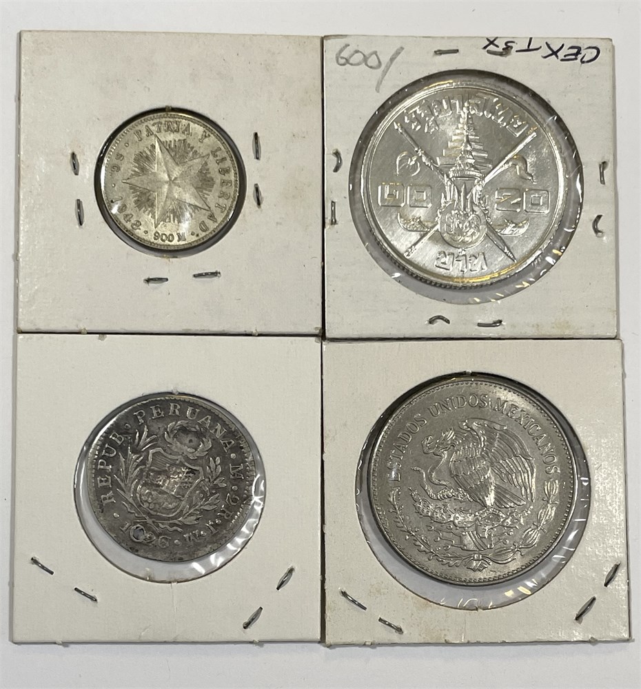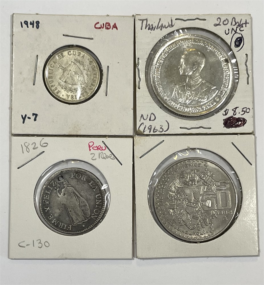 1948 Cuba 20-Centavos, 1963 Thailand 20-Baht, 1826 Peru 2-Reales, 1982 Mexico 50