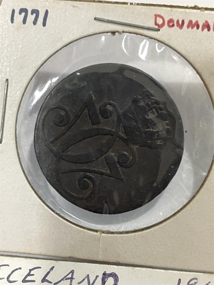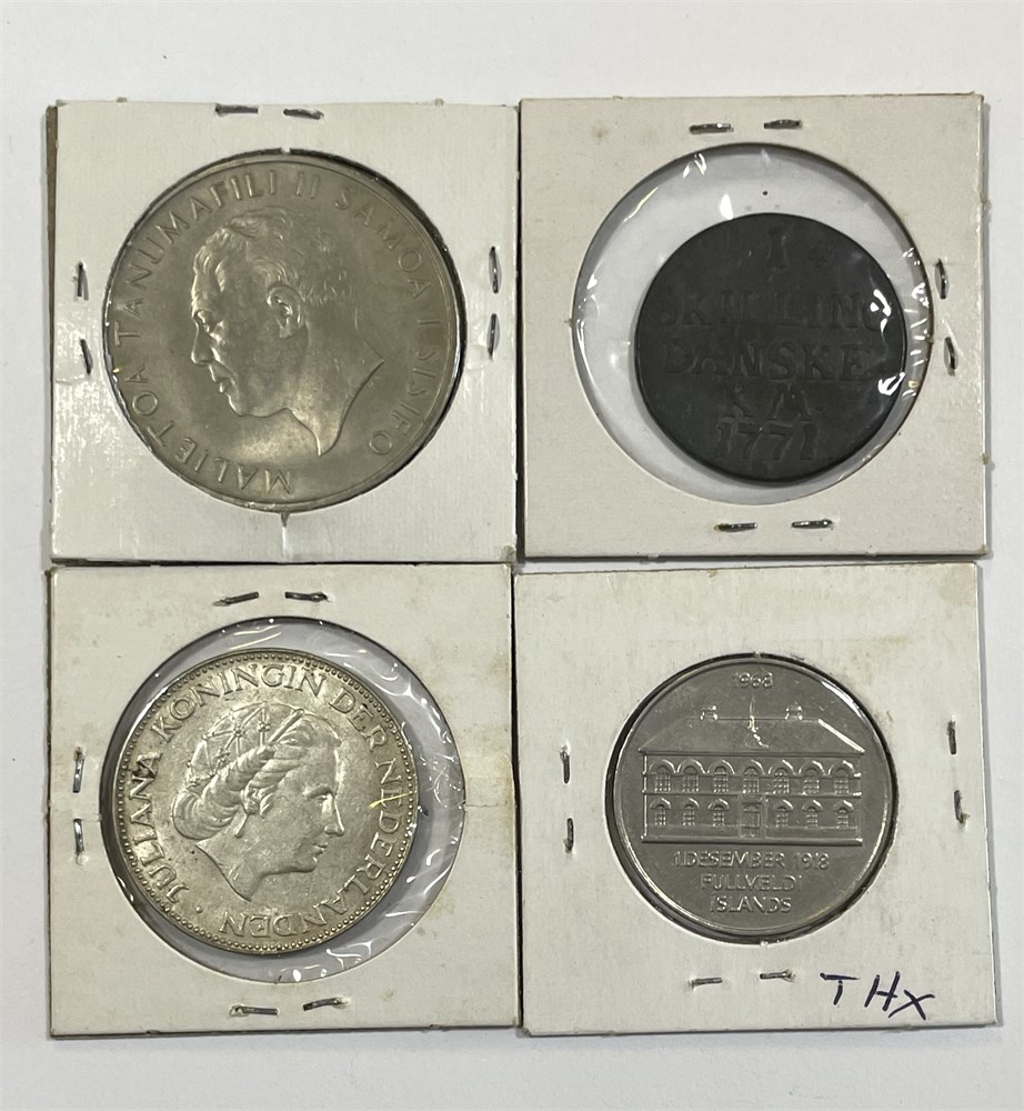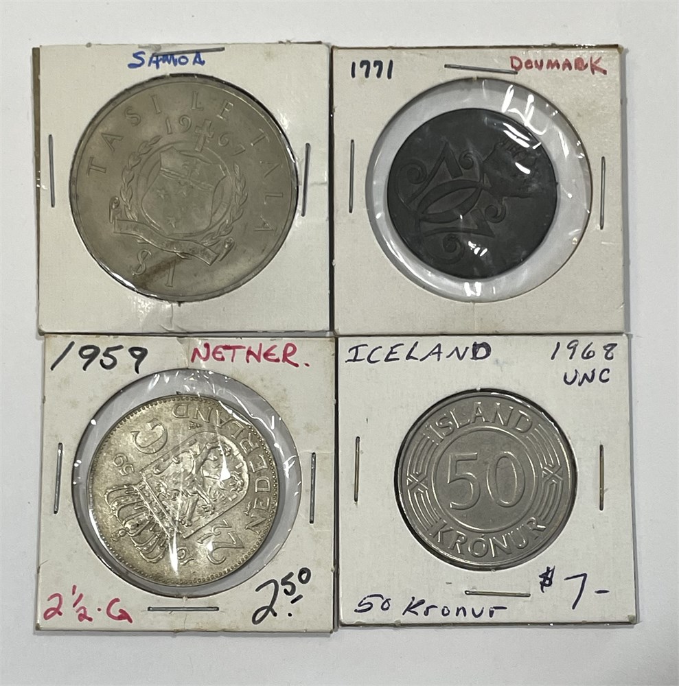 1967 Samoa $, 1771 Denmark Skilling, 1959 Netherlands 2.5G, 1968 Iceland 50 Kr