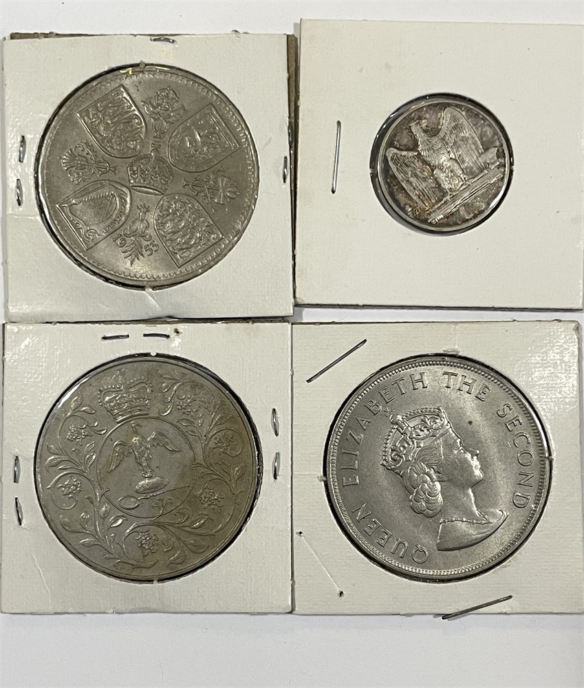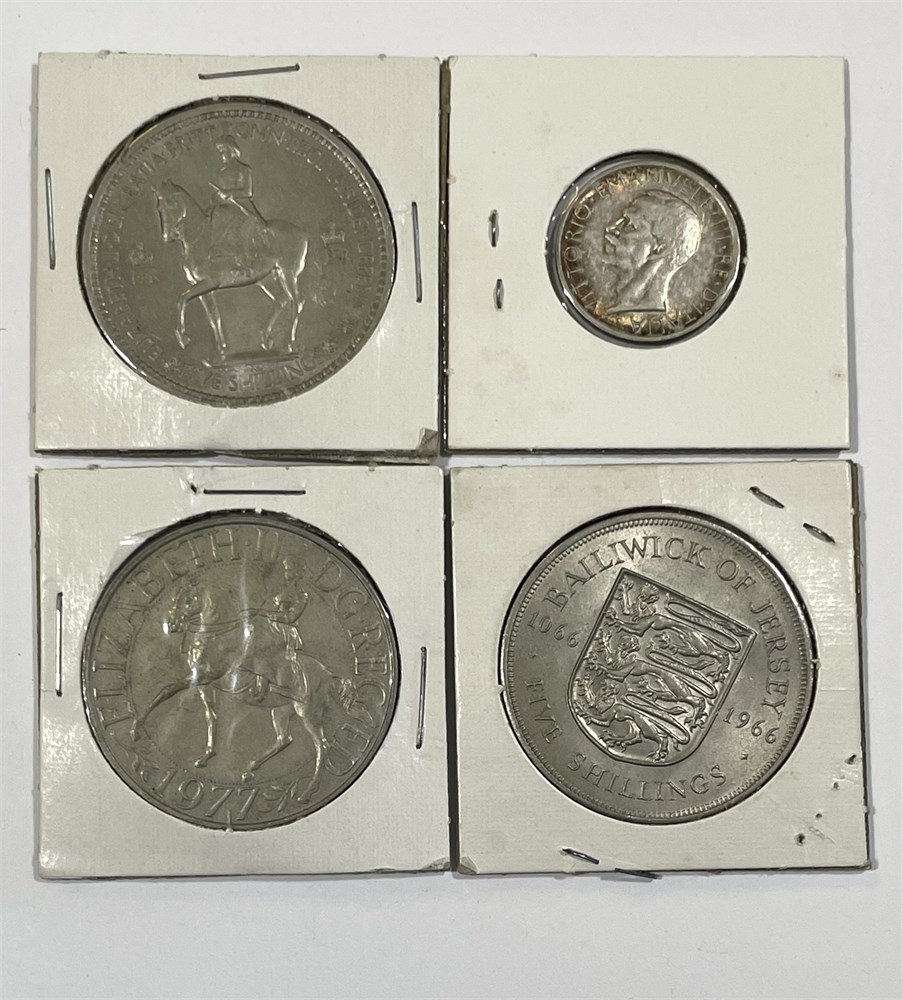 1953 UK 5-Shillings, 1927 Italy 5L, 1977 Elizabeth Comm, 1966 Jersey 5-Shillings