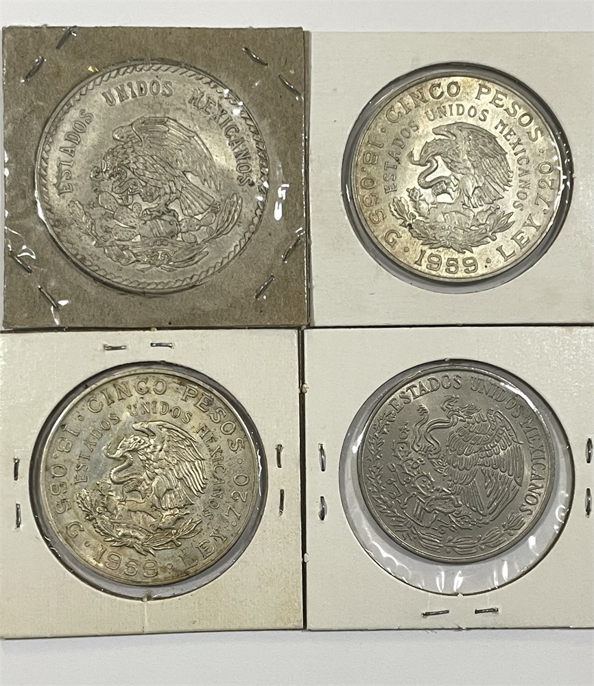 4 Mexican 5-Peso Coins: 1948, 1959, 1959, 1974