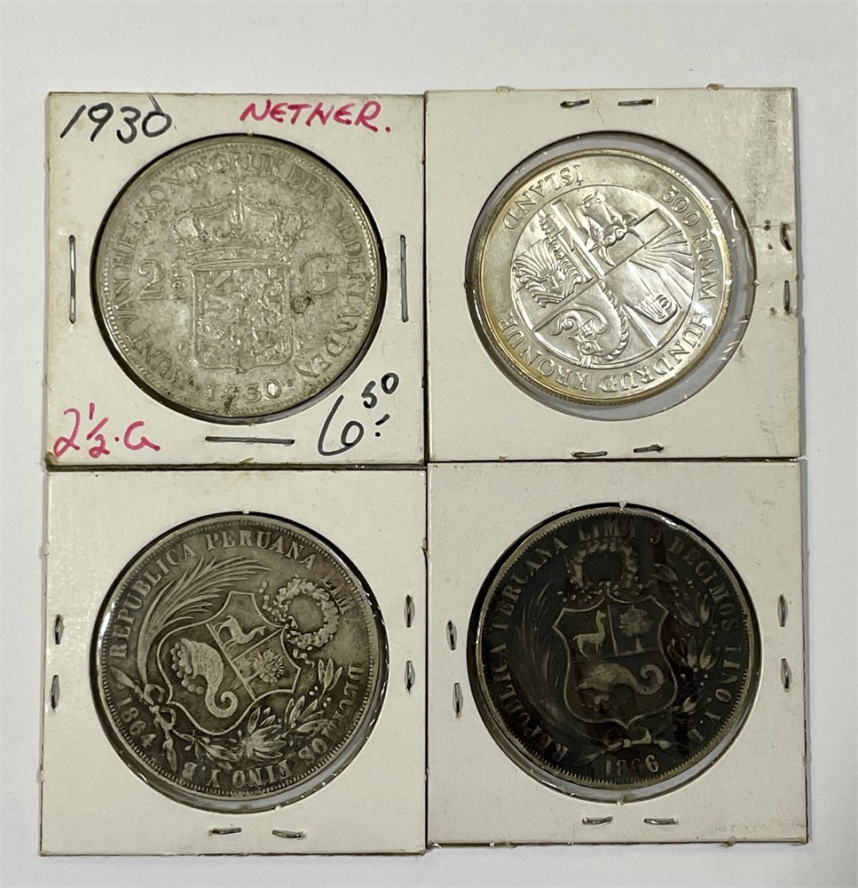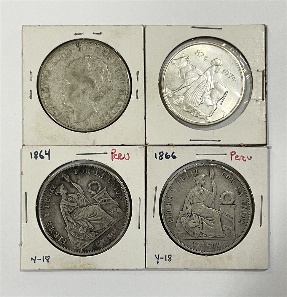 1930 Netherlands 2.5G, 1974 Iceland 500K, 1864 & 1866 Peru Sols; All are Silver