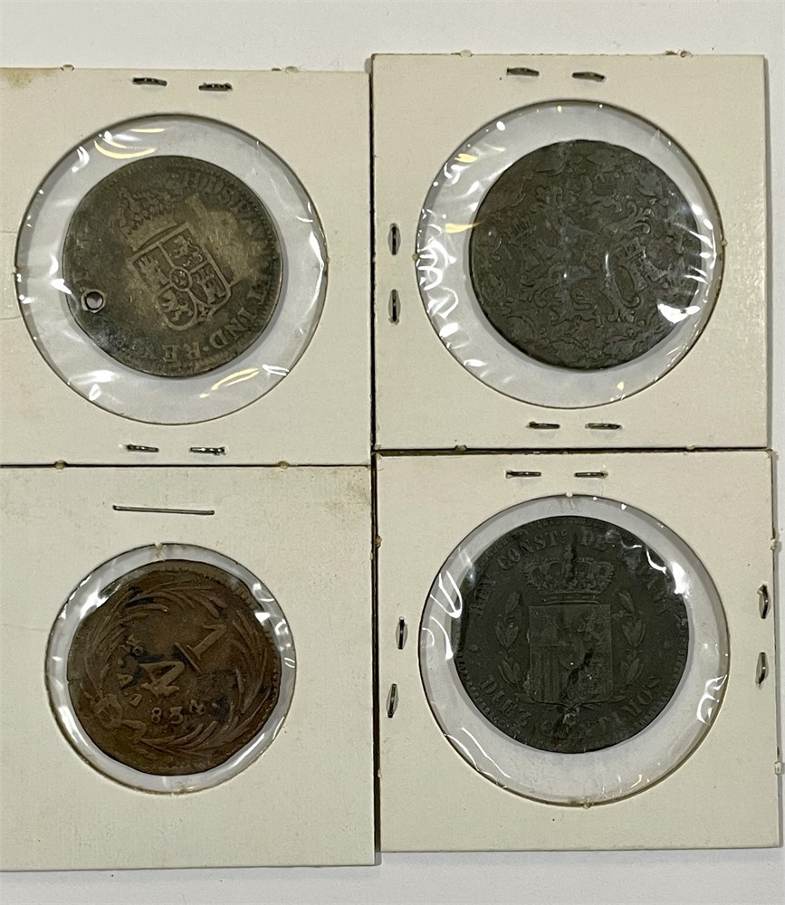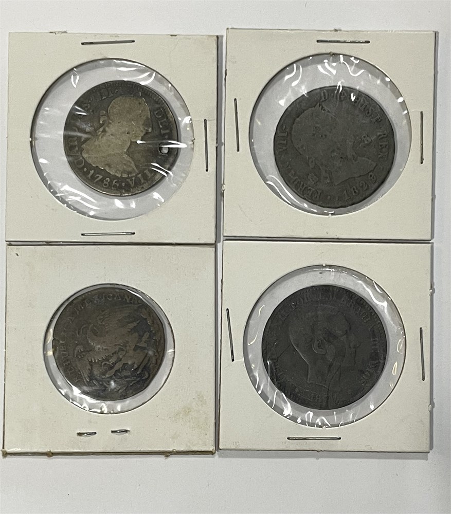 1786 Mexican 2R, 1829 Spain 8M, 1834 Mexico 1/4R, 1879 Spain 10c