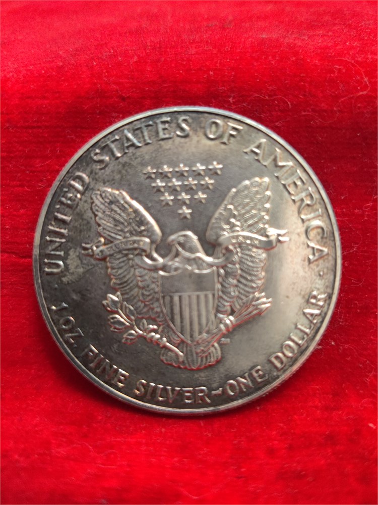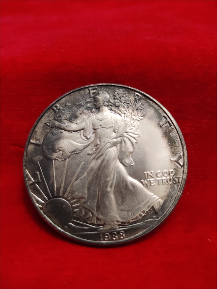 1988 Silver Eagle. Queen has lots of toning. Point is 31.31 g or 1 troy ounce.