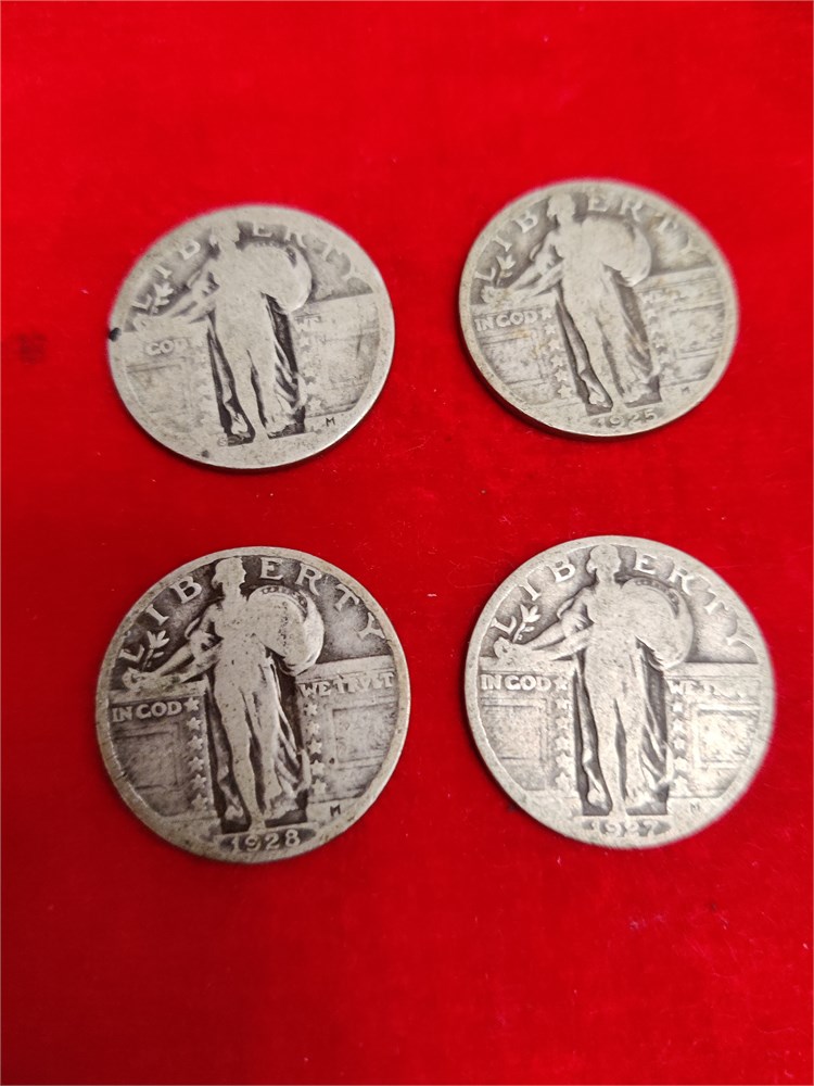 Lot of four standing liberty silver quarters. All for our well circulated coins. Three have legible dates and one coin is not readable. Dates included are 1925, 1927 & 1928.