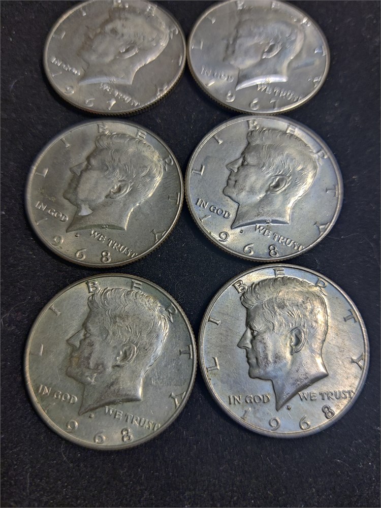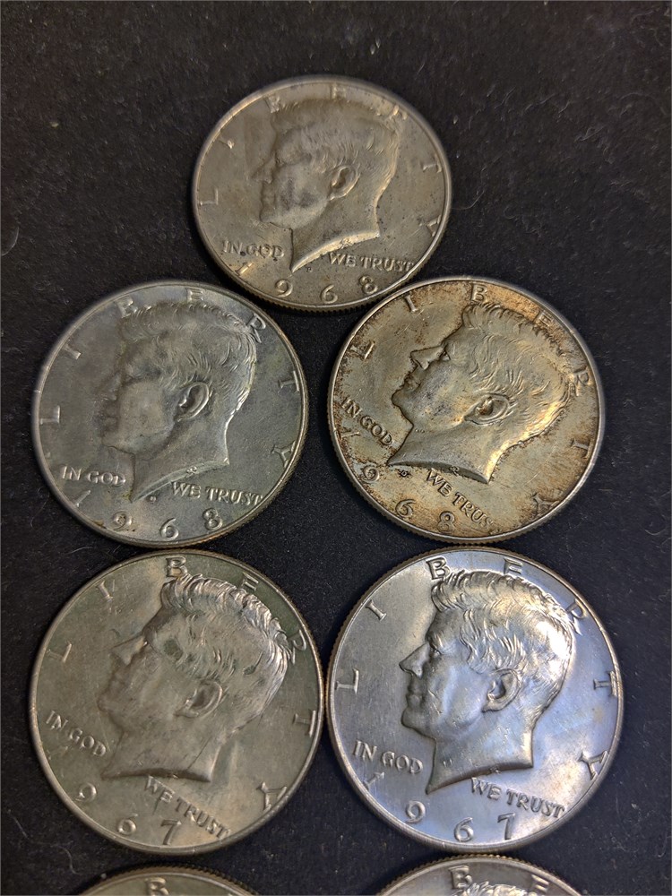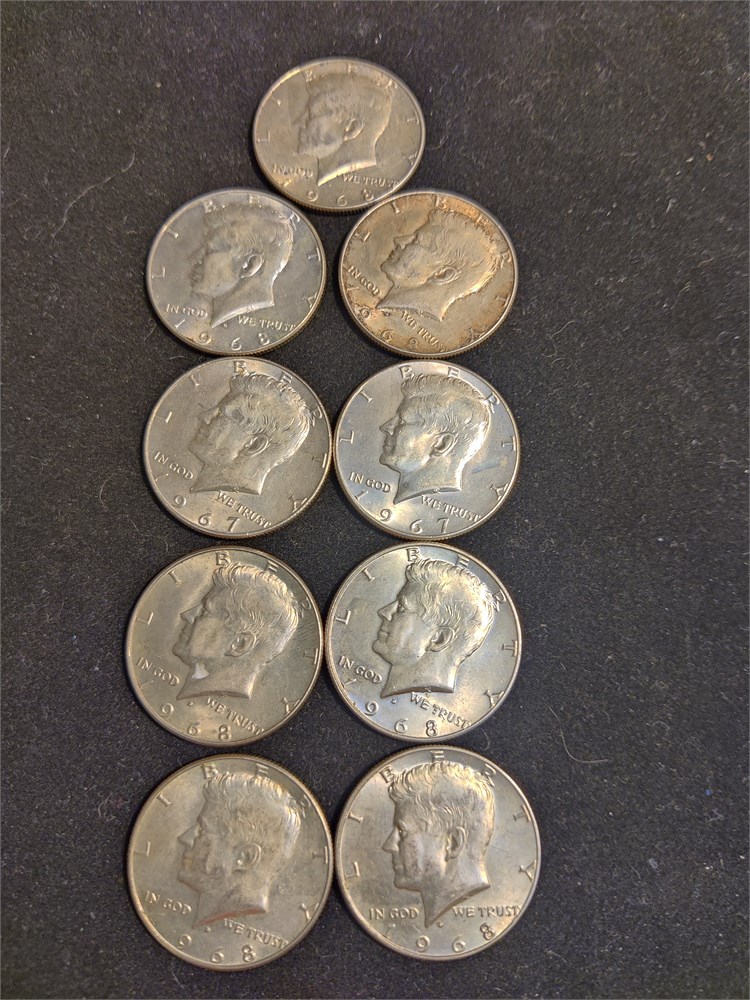 Lot of nine Kennedy half dollars. 7 are dated 1968 and two or 1967. Half dollars or age 40% silver.