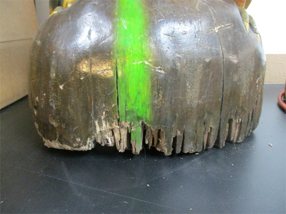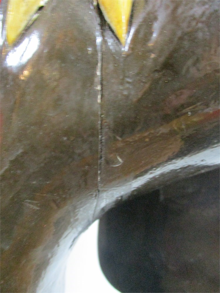 ARTIST MADE. MADE OF WOOD BUT VERY LIGHT IN WEIGHT.  HAS SOME IMPERFECTIONS / REPAIRS (COULD BE HOW THE ARTIST ASSEMBLED. STILL A NICE COLORFUL LARGER THAN LIFE PIECE OF ART.