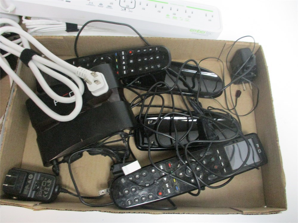 2 Box Lots of Electronics, Remotes, Power Strip, and More