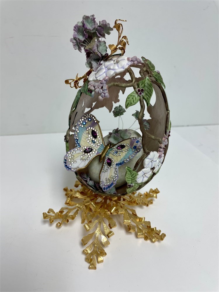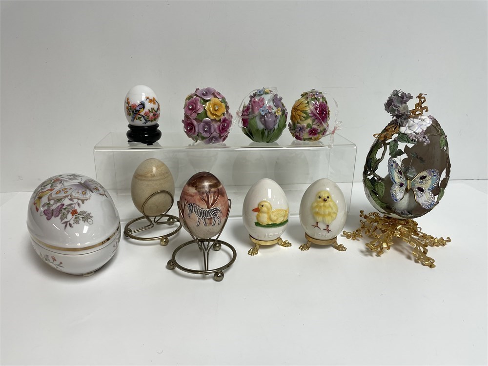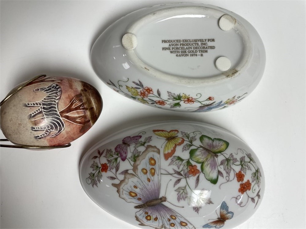 Collectible eggs including an ornate butterfly egg; 1978 and 1979 Goebel eggs; 3 fancy porcelain floral hanging egg ornaments; 2 Kenya stone eggs; Avon cologne bottle and trinket box.