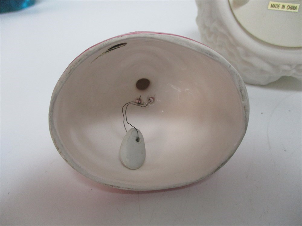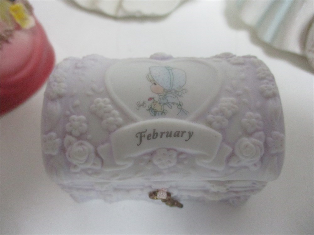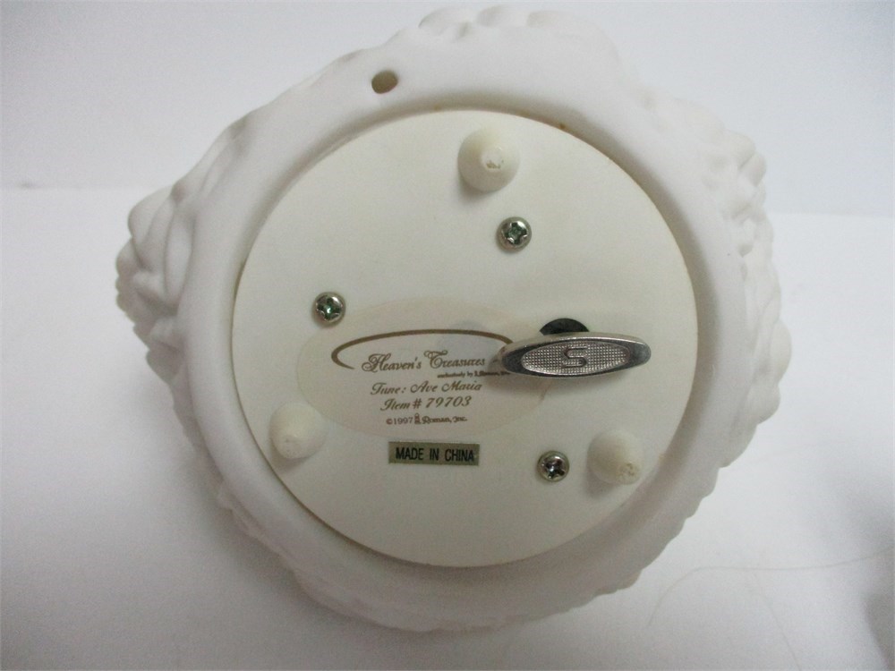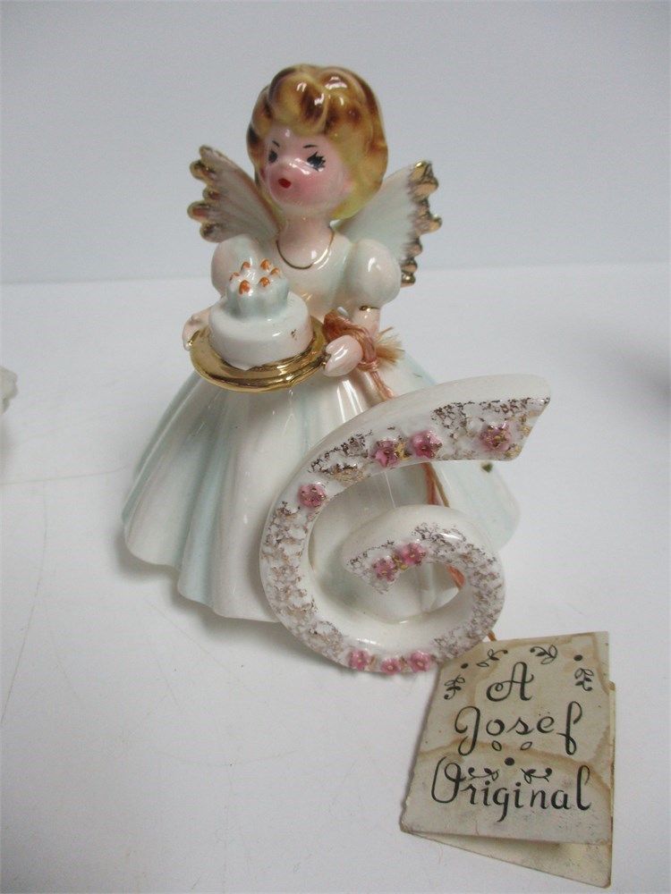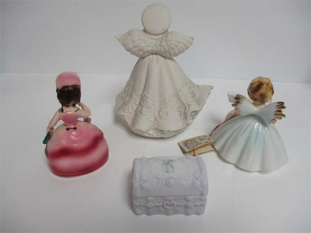A Miscellaneous grouping of Girlie Girl items, including, Josef Original Birthday Girl age 6 figurine, an Angel Musical figurine that plays "Ave Maria", Girl bell, and a Lavender color Floral Trinket Box.  All in good vintage condition.